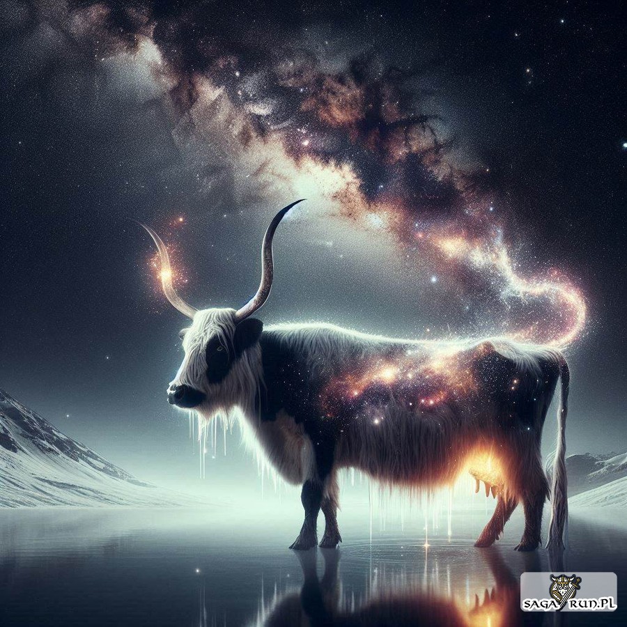 keyboard_returndo góryAudhumla była jedynym środkiem utrzymania życia Ymira, pierwotnego olbrzyma, który powstał z zetknięcia ognia z Muspelheimu i lodu z Niflheimu w przestrzeni Ginnungagap. To jej mleko, które płynęło z czterech obfitych strumieni, stało się pożywieniem dla Ymira, zapewniając mu przetrwanie. Bez niej Ymir, będący sam w surowym środowisku Ginnungagap, nie mógłby istnieć. Audhumla stała się więc pierwszą żywicielką w mitologii nordyckiej, wprowadzając element opieki w chaos pierwotnego świata.
