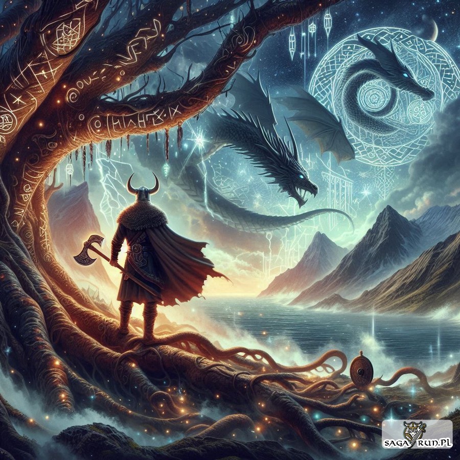 W dziewiątą noc, gdy ból i wyczerpanie niemal doprowadziły go do śmierci, runy pojawiły się przed nim w formie migoczących symboli, które zaczęły świecić w mroku. To był moment przełomowy – moment, w którym ból ustał, a Odyn zrozumiał, że ofiara przyniosła oczekiwany efekt. Runy, te mistyczne symbole, stały się częścią jego istoty, a wraz z nimi zdobył niespotykaną dotąd mądrość – mądrość, która pozwalała mu rozumieć i kształtować przeznaczenie, magię i porządek rzeczywistości.